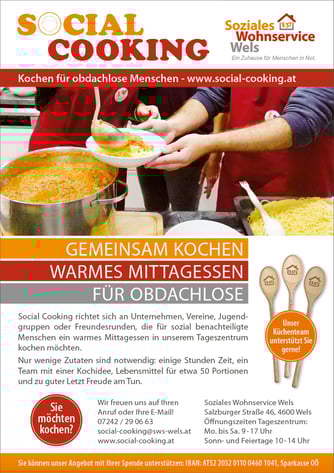 Social Cooking richtet sich an Unternehmen, Vereine, Jugendgruppen oder Freundesrunden, die für sozial benachteiligte Menschen ein warmes Mittagessen in unserem Tageszentrum kochen möchten.